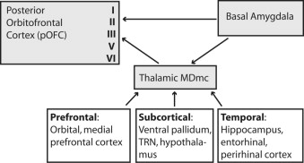 Schematic representation of direct projections from the amygdala to posterior orbitofrontal cortex, as well as indirect projections through the thalamic mediodorsal magnocellular (MDmc) nucleus, which is innervated by the amygdala. The terminations in the cortex show the predominance of direct amygdalar projections to the superficial layers and MDmc projections mostly to the middle cortical layers. The strong reciprocal projections from orbitofrontal cortex to MDmc and from posterior orbitofrontal cortex to the amygdala are not shown. TRN, thalamic reticular nucleus.