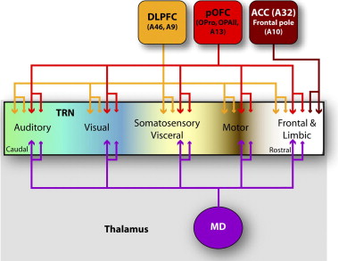 Prefrontal and mediodorsal thalamic projections to the thalamic reticular nucleus (TRN). Different TRN sectors are color-coded based on projections from cortical areas (frontal and limbic: white; motor: brown; somatosensory/visceral: yellow; visual: blue; auditory: green). Projections from all prefrontal cortices and the mediodorsal nucleus in the rhesus monkey are concentrated in the rostral (prefrontal) sector of TRN. However, mediodorsal nucleus, dorsolateral prefrontal (areas 46 and 9), and the posterior orbitofrontal cortex also extend projections to the central and posterior sectors of TRN, potentially influencing the flow of information from sensory and motor thalamic nuclei to the cortex. In addition, prefrontal