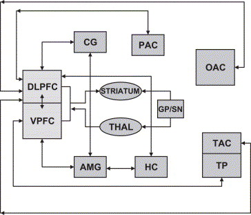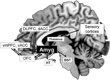 In this model, the DLPFC is involved in the effortful manipulation or interpretation of the stimulus and the VLPFC may have a function in the selection of emotion interpretation . The changes observed in the amygdala are the result of the top down modulation of the emotional meaning of the stimulus. One important aspect of this model is that the DLPFC does not project directly to the amygdala