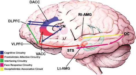 Functional brain circuits in pediatric bipolar disorder: cognitive circuitry shows the key link between the DLPFC and the caudate involved in attentional control and the connection between the VLPFC and the caudate/ventral striatum implicated in response inhibition and attention. Frontolimbic affective circuitry spanning from the VLPFC to the amygdala participates in top-down regulation of emotion. Interfacing circuitry illustrates the functional connectivity between cognitive regions (DLPFC and dorsal anterior cingulate cortex) and affective regions (VLPFC and VACC/pregenual and subgenual anterior cingulate cortex) at the level of the prefrontal cortex and the intermediary anterior cingulate cortex, working in concert in people without disorder. Face response circuitry connects the visual or occipital cortex with fusiform gyrus (not shown here) and the STS. The occipitolimbic associative circuitry connects the occipital cortex to the right amygdala, involved in fast or automatic processing of emotional/facial stimuli. DLPFC = dorsolateral prefrontal cortex; VACC = ventral anterior cingulate cortex; VLPFC = ventrolateral prefrontal cortex; STS = superior temporal sulcus.