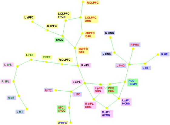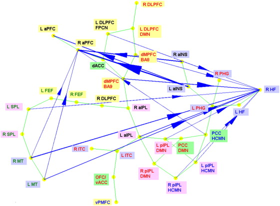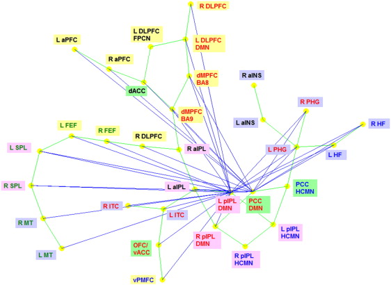 instantaneous correlation between the ROIs is shown as green lines. The distance between the nodes indicates the strength of their connection. The correspondence between ROI font colors and the RSNs is as follows. Red: default mode network (DMN), green: dorsal attention network (DAN), blue: hippocampal–cortical memory network (HCMN) and black: fronto-parietal control network (FPCN). The correspondence between ROI background colors and their anatomical location is as follows. Yellow: frontal cortex, pink: parietal cortex, blue: temporal cortex and green: cingulate cortex.