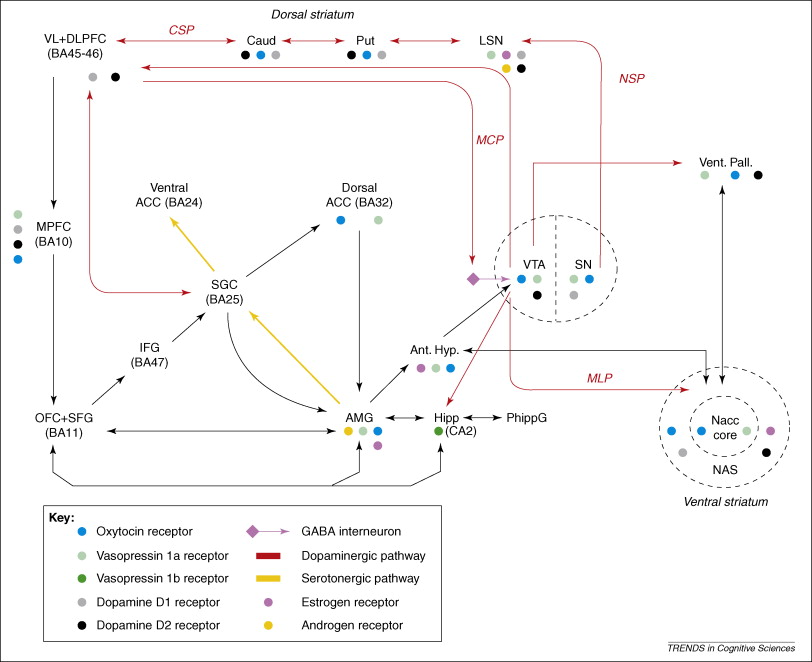 dopaminergic-neuropeptide interactions in the social brain. This figure is a simplified account of neural circuits that are believed to contribute to the regulation of the social brain. Only a subset of interconnections between brain regions involved in processing emotions and social perceptions is shown. There are also noradrenergic and serotonergic outputs (from the locus coeruleus and the dorsal raphe, respectively), which innervate most of the regions illustrated. Glutamatergic pathways not shown include inputs from frontal cortical regions, the hippocampus and amygdala to the VTA and nucleus accumbens (NAcc) [73]. Circuits potentially responsive to social reward encompass the corticostriatal pathway (CSP), the nigrostriatal pathway (NSP), the mesocortical pathway (MCP) and the mesolimbic pathway (MLP). These dopaminergic circuits link the dorsal and ventral striatum to the prefrontal cortex. The ventral striatum is involved in the prediction of future probable rewards as a consequence of personal actions. By contrast, the dorsal striatum monitors the outcome of those actions, querying ‘was the reward achieved?’ to choose better actions in future [74]. The model is an oversimplification of the organization of neural systems that underpin the complex human interplay involved in social interactions [75]. Abbreviations: ACC, anterior cingulate cortex; AMG, amygdala; Ant. Hypl, anterior hypothalamus; BA, Brodmann area; Caud, caudate; CSP, corticostriatal pathway; Hipp, hippocampus; IFG, inferior frontal gyrus; LSN, lat