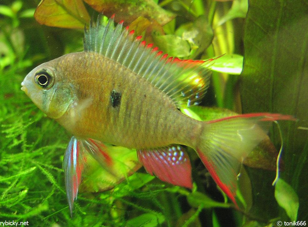 Tyto modre cichlidky v nasem akvarium uvidite v paru klidne korzovat po akvariu, pripadne zalezle v ukrytu. Samec je vetsi s delsimi konci ploutvi, samice je drobnejsi s okrouhlymi ploutvemi. Udajne je mozne chovat i v malem haremu [jeden samec, dve samice]. Treni probiha na ocisteny kamen, o mladata se stara samice, samec si jich spise nevsima.