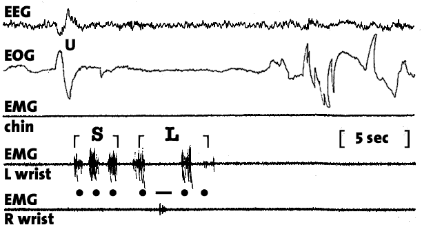 Figure 4. Morse code communication from the lucid dream. Evidence of voluntary control of other muscle groups during REM was found by LaBerge, Nagel, Dement, and Zarcone (1981) while testing a variety of lucidity signals. We observed that a sequence of left and right dream-fist clenches resulted in a corresponding sequence of left and right forearm twitches as measured by EMG. Here the subject sends a Morse code signal with left and right fist clenches corresponding to dots and dashes, respectively. Hence the message translates as “SL” (… .-..), the subject's initials. Note that the amplitude of the twitches bore an unreliable relationship to the subjective intensity of the dreamed action. Because all skeletal muscle groups except those that govern eye-movements and breathing are profoundly inhibited during REM sleep, it is to be expected that most muscular responses to dreamed movements will be feeble. Nonetheless, these responses faithfully reflect the motor patterns of the original dream.