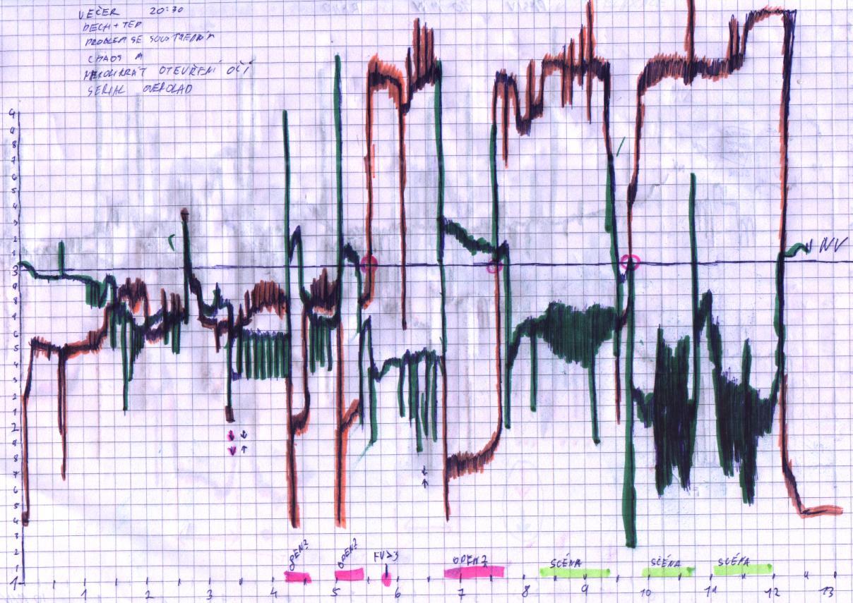 - T green line = dream scene , no loger flashes of image but scene (may be caused by visualization , automatic asociation about thought tema , or themselfs)