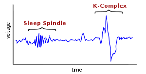 - However in this study neither the probability of appearance nor the power of spindles correlated to the amplitude or any other feature of the K-complexes that preceded them. When K-complexes appeared spontaneously after the start of a sporadic spindle, the spindles were invariably shut down for the duration of the K-complex, usually being replaced by a short lived oscillation in the high theta frequency band. Also the spindles appearing immediately after a K-complex had invariably faster spectral frequency than the sporadic spindles. Such findings suggest that the association of K-complexes with spindles is strong but may be due to a common trigger rather than a causative interaction.